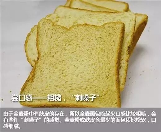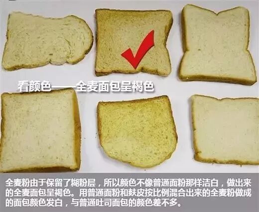 辨别方法:加工出来的面包外表、口感像全麦面包,不过吃起来虽然有粗糙感,但麸皮在嘴中的感觉,没有小麦颗粒的饱满。