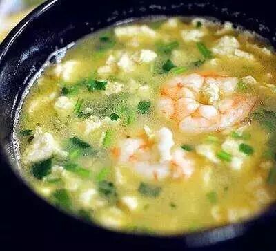 3、锅中加入适量清水,大火煮沸后放入虾仁煮10分钟,倒入蛋液、加葱末、姜末、盐和香油调味即可。