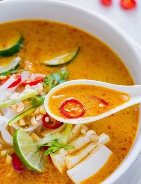 咖喱有很多种,而泰国咖喱中加入了特有的椰浆来减低辣味,同时也增强了咖喱的香味。另外泰国人还会在咖喱中加入香茅、鱼露、月桂叶等香料,这些都让泰国咖喱独具一格。所以泰国咖喱看上去浓郁,混入各种菜式中,秀色可餐,让人看上去很有胃口。