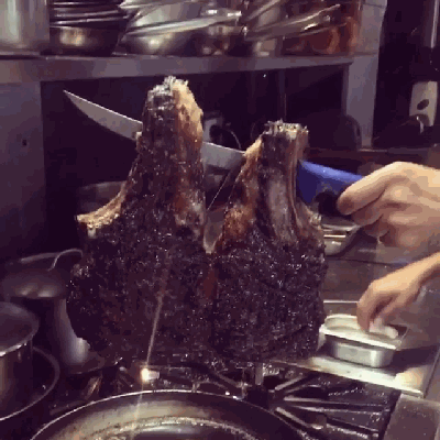 看看着麻利的拍打,牛的排骨被整齐的拍断,一气呵成!来看看他的招牌撒盐动作吧!