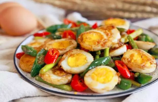 1.将鸡蛋煮熟,凉水里放凉后拿出剥壳切片。青红椒切圈,蒜苗切断。