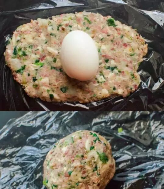 2. 将煮熟的鸡蛋剥壳,在鸡蛋外面均匀地裹上一层1cm厚的土豆瘦肉泥。