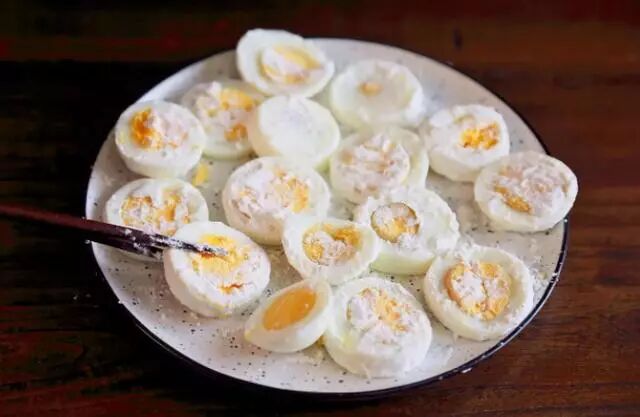 1. 鸡蛋煮熟捞出浸冷水,剥壳;将鸡蛋三七分,七分处捞去蛋黄;