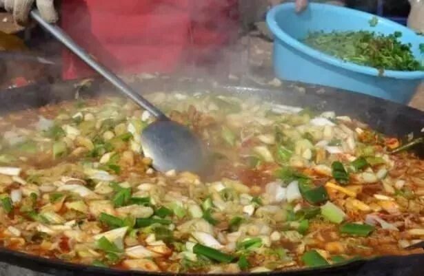 大烩菜,主要原材料是肉片、炸豆腐、土豆块、炸肉丸、黄豆芽、茄子、豆角、海带和粉条等。在河南人心中,此菜实惠,吃得饱,种类多,一锅烩出来,大碗盛出来,端着一碗冒尖的烩菜,手拿一到两个馒头,吃起来真够劲。