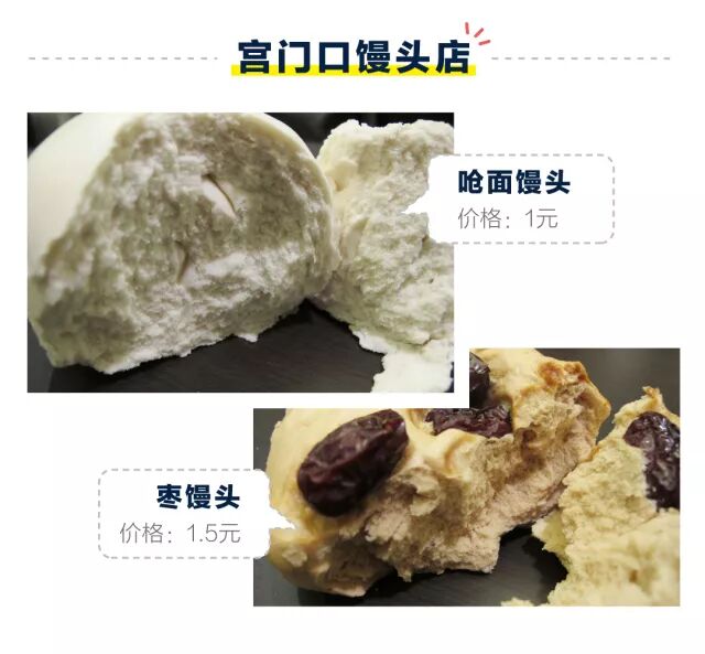 在友谊医院对面的这条嘈杂的小街上,藏着很多老北京传统小吃,有人来找白毛煎饼,有人来吃天津烧饼,而宫门口稳稳的开了十几年,每天一到饭点,门口就排起了长队。当然是要买呛面馒头的,一块钱一个,暄软扎实有韧劲。我更爱吃1.5一个的枣馒头,里面有7、8颗枣,混了红糖的面,趁着热气吃一口,一定会被浓郁的枣香折服。
