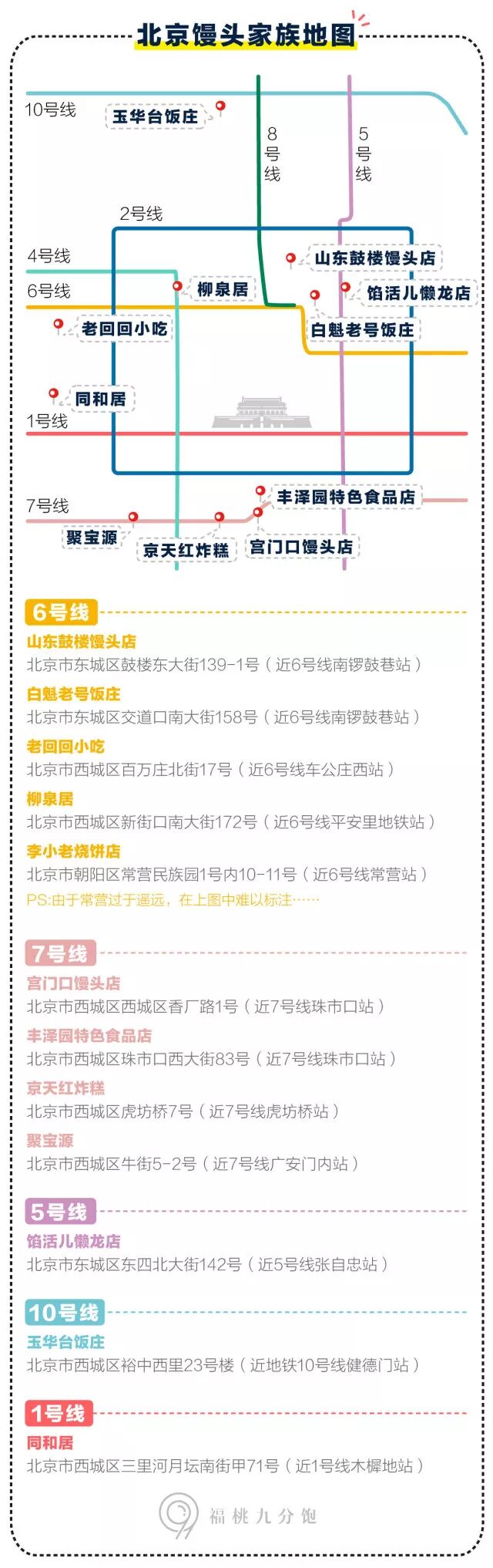 如今,蒸食铺的数量早就无法同以前相提并论,但北京人对这蒸食的需求热度从未消退,为了将这份味道的回忆延续,福桃编辑部暴走北京城,游街串巷搭地铁,穿越东城、西城、海淀,甚至到了6号线的彼端——通州,共寻觅到12家货真价实的店,制成这张宝贵的北京馒头家族地图。