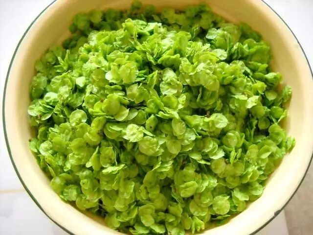 榆钱,是榆树的种子,因其外形圆薄如钱币,故而得名,又由于它是“余钱”的谐音,因而就有吃了榆钱可有“余钱”的说法。能生吃,能煮粥,能和馅,味道鲜嫩脆甜,别具风味。