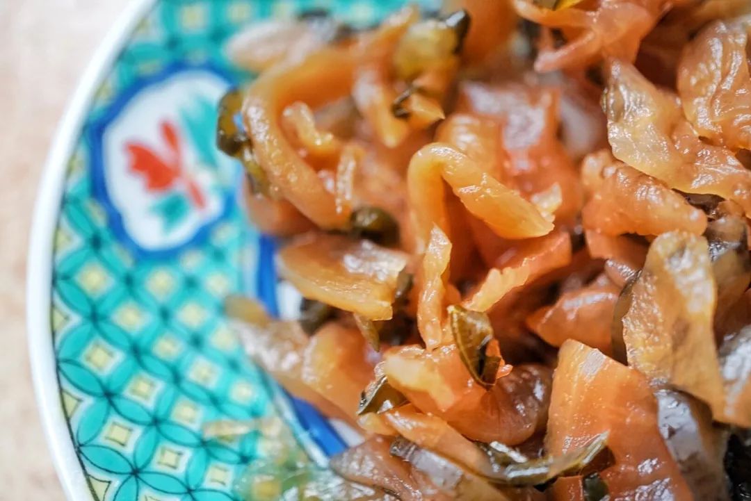 这款酱菜比较有趣的地方,是用萝卜、茄子、黄瓜、刀豆、莲藕、紫苏、生姜等等不同蔬菜,混上鲣鱼汁来一起腌渍,比较香,不是太咸,难得酱菜做出了小清新口感,偶尔尝个新鲜挺好的: