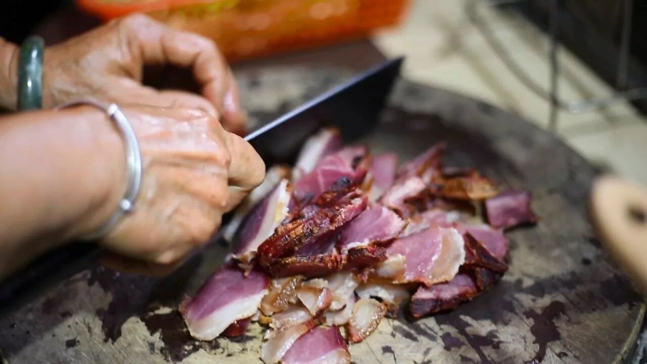 等肉质变硬,肉色变深,腊肉就做好了。烟火味嵌入肉中,它成了湘西腊肉的灵魂。熏干的腊肉可以吃一整年。