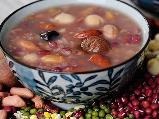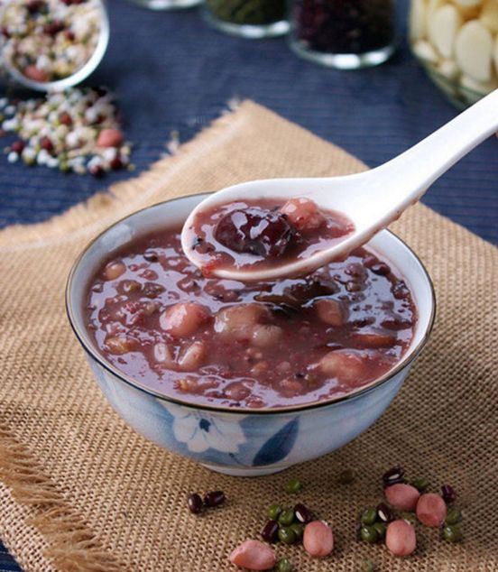 北京的腊八粥,用薏米、白米、小米、栗子、去皮枣泥等和水煮熟,然后用桃仁、杏仁、瓜子、花生、榛子、松子及白糖、红糖、葡萄干来做点染。
