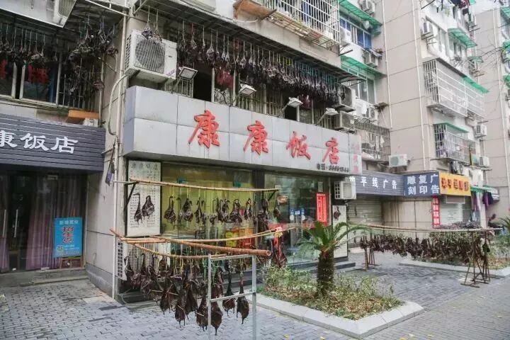 从秋涛路拐到景芳路,老远就能看到「康康饭店」,门口、窗前,甚至二楼都挂满了酱货。