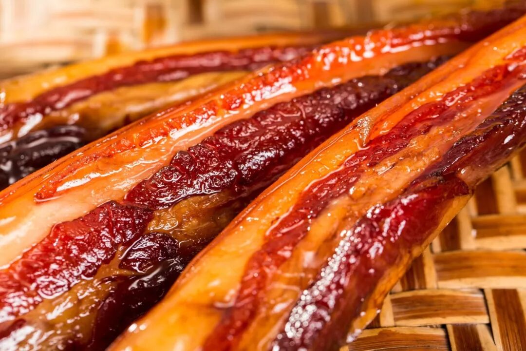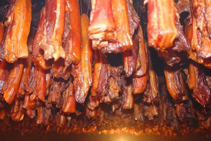 一些讲究的家庭,还把腌制的鲜肉先用柏树枝、甘蔗皮、椿树皮或柴草火慢慢熏烤,蒸发其中的水分,然后再挂起来用烟火慢慢熏干而成。熏制好的腊肉表里一致,晶黄剔透,煮熟切成片,透明发亮,色泽鲜艳,黄里透红,吃起来味道香醇,肥而不腻,不仅味道独特,营养丰富,而且还有健脾祛寒、消食开胃等功能。
