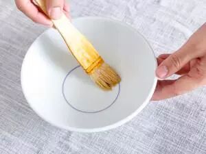 3.取一瓷碗,用毛刷在碗内抹上猪油。一来方便等下在碗底放干果“定位”。另一方面,这样蒸好的八宝饭更有光泽。(如果是做很多冻进冰箱,那就直接铺上保鲜膜就好了。这一步就省略。)