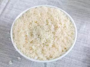 2.米饭倒入大的料理盆中,趁热拌匀猪肉和糖。如果讲究一些,可以用冰糖粉代替白砂糖。当然,这细微的口感差别,不是那么明显。