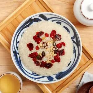 糯米350g、红豆沙250g、猪油50g、白砂糖50g、红枣4颗、熟核桃5颗、西瓜子仁少许、葡萄干少许、桂圆干25个、松仁少许、