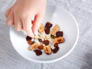 4.瓷碗底部铺上自己喜欢的干果。我是非常喜欢放桂圆肉和葡萄干的。红绿丝就很讨厌。入蒸锅大火蒸10分钟后取出,倒扣装盘即成。