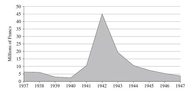 图2.Drouot拍卖油画的金额(换算成1938年法郎币值),数据源:Oosterlinck (2017)页2673