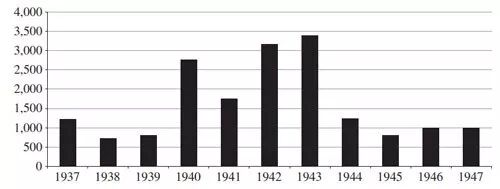 图1.Drouot拍卖油画的数量(1937-47),数据源:Oosterlinck (2017)页2673