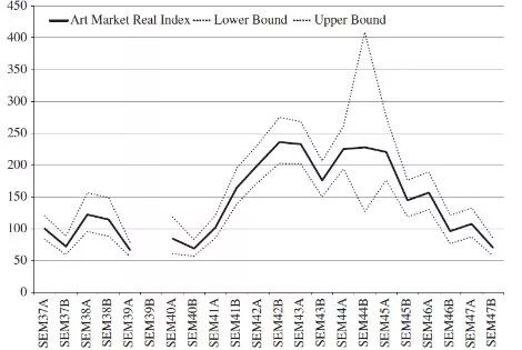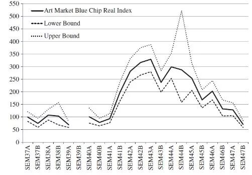 这表示二战激烈期间,艺品拍卖异常活跃,反而比1945年战后表现更佳。这种情景和英国形成明显对比:英国指数在1937年为100(英法相同),1941年71.7,之后缓升到1947年的105。二战期间英国物价高涨,但艺品指数要到1944年,才回复1934-9年的水平。纽约艺品指数是另一番景象:1941年二战正热,指数就回到1929年大萧条前的水平。