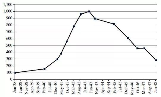 图7.邮票的实质(去除物价变动)指数,1938-47,数据源:Oosterlinck (2017)页2690