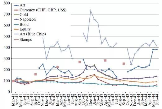 接下来,图5显示油画与其他7种投资的指数对比:艺术品、绩优艺品、证券、公债、邮票(这五种在合法市场交易);还有三种在黑市交易:黄金(拿破仑金币)、黄金(依据拿破仑金币、法币、黄金美元制定的指数)、外币(依据英镑、美元、瑞士法郎制作的指数)。为何迟至1941年3月才开始对比?因为要到1941年3月,巴黎证券才回复交易。在此之前,资产只能在黑市交易,无可靠数据可用。