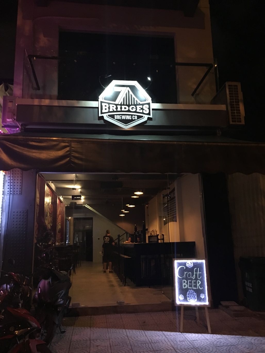 就在我们离开岘港的最后一天,终于发现了在这里最大的收获,7 Bridges!我们抵达这家酒吧的时间大约是22:00,店内空无一人,一打听才知道,因为目前是试营业阶段(第三周),22:00就关门了,和老外店长聊了几句,发现我们也是精酿爱好者,就特意为我们延长营业时间还带我们参观了一下。