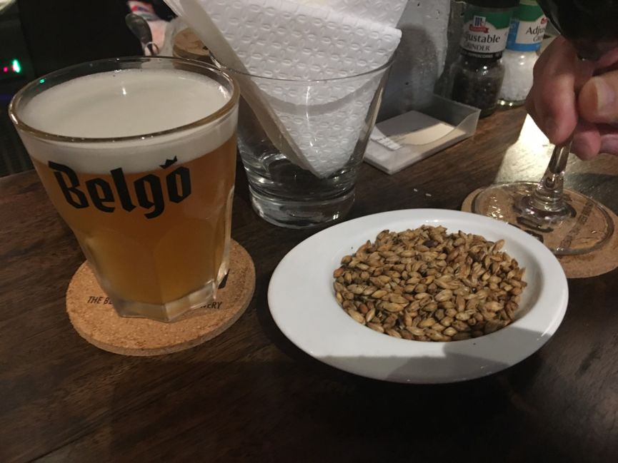 我点了一杯店内自酿小麦,味道不错,十分规矩。喝了一口发现泡沫下面藏着一片橙子,明显是学美国的蓝月,何必呢……这盘免费零食就是麦芽了,嚼上一粒还是挺香的,而且比花生成本低多了。