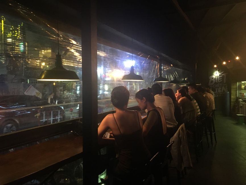 在西贡无论餐厅还是酒吧,大多数都有户外空间,BiaCraft也不例外。从第一张图可以看到,这家店的2/3空间都是半室外环境,虽有顶棚,但是四周并无任何格挡,大多人也喜欢坐在临街的位置,那么一旦下雨怎么办呢(西贡下雨十分频繁),一个电动的透明塑料布会自动降下,挡住风雨留下街景,非常实用有趣的设计。