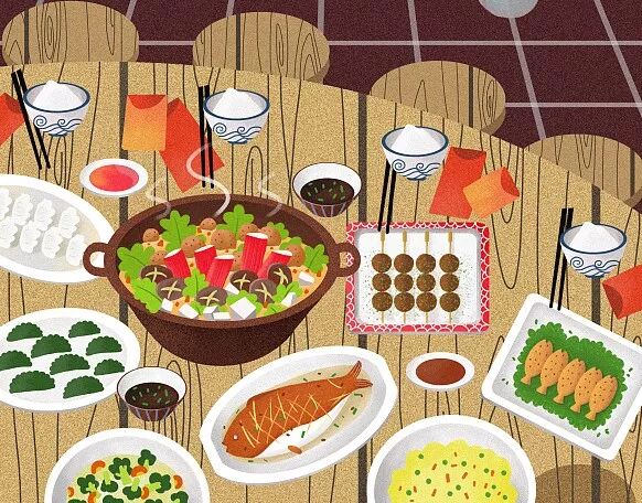 在那以后,我即便经历了再多的春节,但一谈起年夜饭,浮现在我脑海里的依旧是和阿婆在一起吃饭的场景。那时,亲戚围坐在桌子旁,我坐在阿婆旁边,桌子上有蒸鲈鱼、白灼虾、白切鸡、菌菇汤……大家脸上都挂着笑容。
