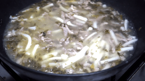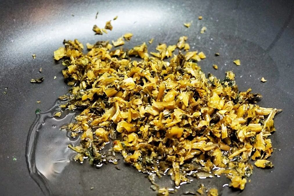 先炒肉丝,然后炒嵊州特产的雪里蕻咸菜,此时油温不能太高,中小火慢炒出雪菜的香味,雪菜自带咸鲜,这道菜就不需要再加任何调味~