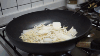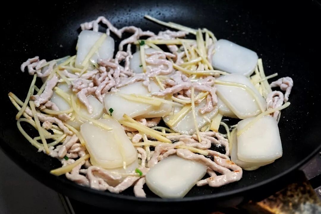 热锅后,放 1 瓷勺(15g)油,依次下肉丝、笋丝和年糕片。然后加 20g 热水,等水烧干后年糕如果还硬,就再加热水。