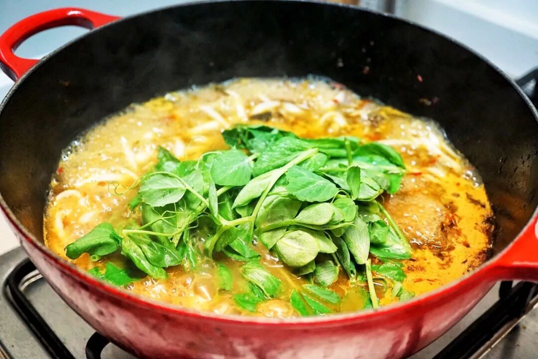 水烧开,放酸腌菜和米线帽子,煮好汤底再加入饵块。
