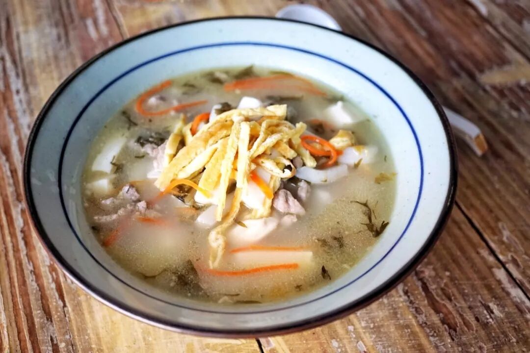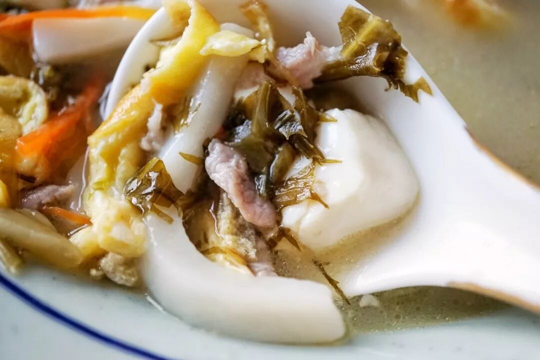 饵块的口感像切细的年糕条,软糯有弹性。汤底酸酸辣辣,简直像豪华版「老坛酸菜面」,好吃到停不下!