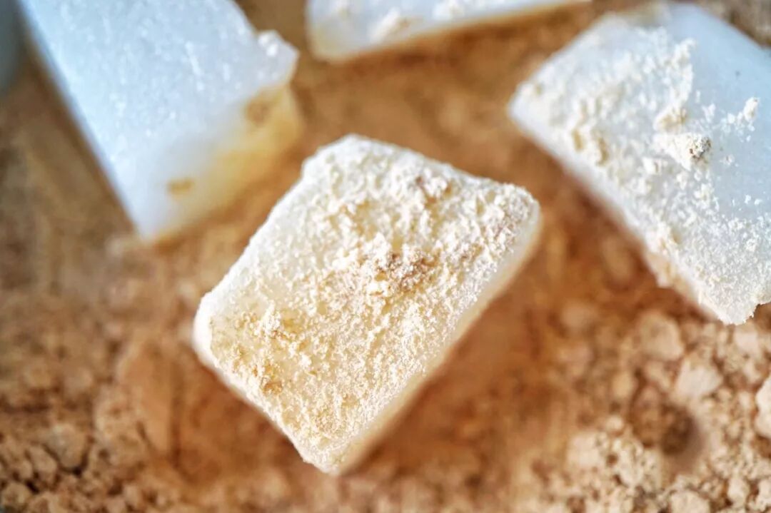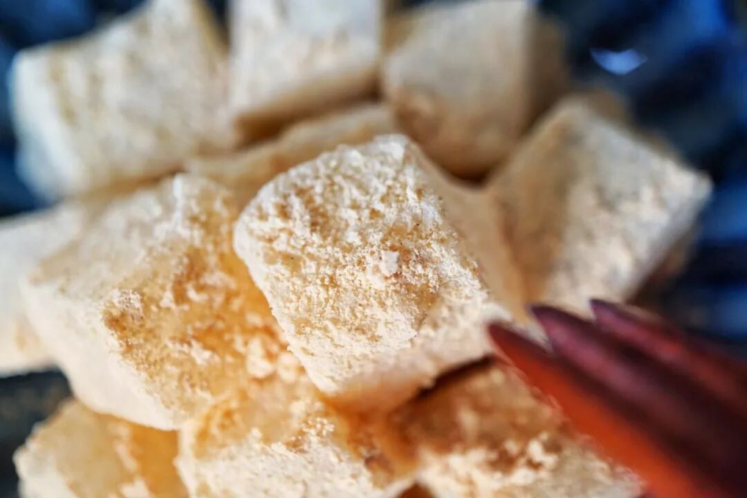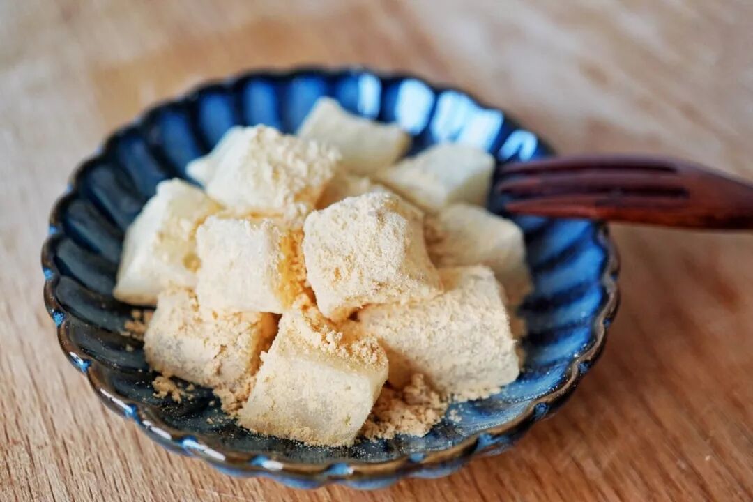 裹上黄豆粉,这家的黄豆粉豆香十足,和甜味年糕完美搭配~