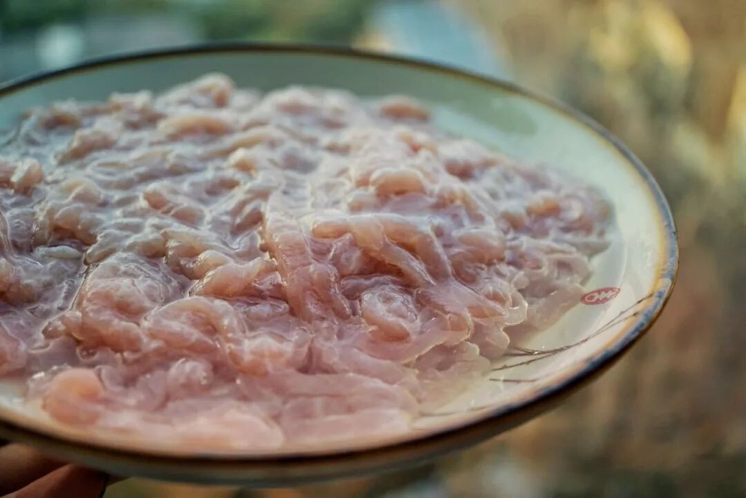 200g 猪里脊肉切丝,提前腌:加 1 调料勺盐、1/3 瓷勺料酒、蛋清 1 个、1 调料勺生粉搅拌均匀,然后表面封一层油,盖上保鲜膜冰箱冷藏半小时,取 80g 出来。
