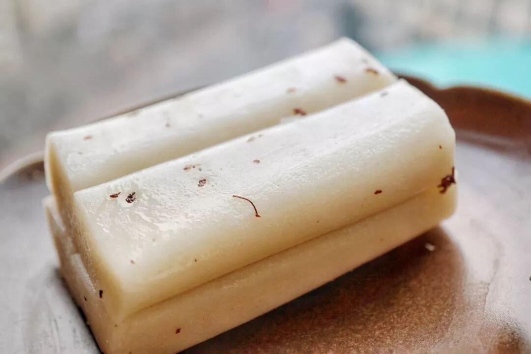 在云南,米制品的变化千千万,这种饵块来自曲靖。黄色是加了玉米面,吃下来区别不大。
