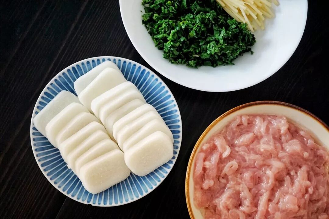 原料:年糕 200g,肉丝 80g,荠菜(切碎)80g,冬笋(切丝)80g