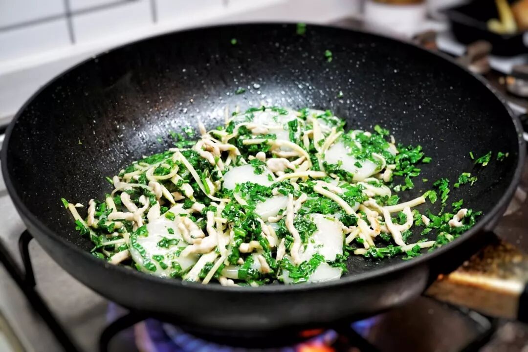 最后放入荠菜,加 5g 盐调味。不要炒太久,才能保持荠菜碧绿鲜嫩。