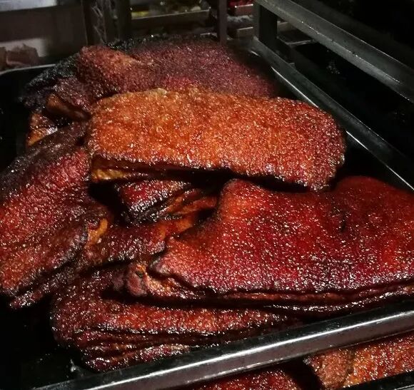 老李的毛细扣肉,只挑当天刚宰杀的猪其带皮的三层五花肉部分作为原坯,这大抵是最为香艳的一类肉材了,白肥红瘦,脂油香滑,一头猪也就够做8到10份。将新鲜的肉切割成长方形块状,放入蒸柜。肉蒸好后,放入沸水中淖过,接着在葡萄酒水里上色,再将肉皮朝下走油起炸,砰砰的炸响声,与窗外的节庆鞭炮作二重唱,工序再复杂,内心都是欢喜的。