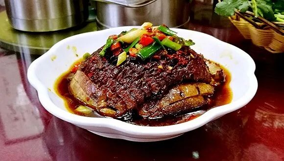 如此在高温下蒸上两个半小时,水汽氤氲,蒸至软烂,汤汁不多黏一分,也不薄一层。一份毛细扣肉就可以上桌了。皮好吃,而肥肉经炸后油腻已去,最后一层被皮和肥肉扣着的精肉,条条丝丝,也耐嚼有味。当然,最下饭的还是那用来吸取蒸出肉油的干豆角,香辣酸多味混在了一起。
