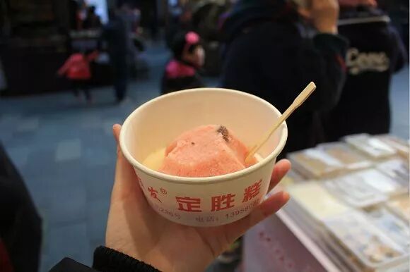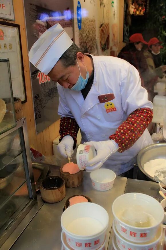 “师傅,这种糕为什么叫定胜糕呀?”正忙着做糕的老大爷顾不上讲话,用手指了指墙上的介绍海报,在店门口靠着休息的另外一位老大爷悠悠地接了腔:“定胜糕么,就是南宋岳飞打了胜仗,老百姓为了庆祝送给军队里吃的,图吉利的。”