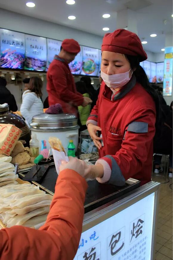 “这个要趁热吃,冷了就不香了,蘸点甜面酱更好吃啊。”点心师傅双手利落地把刚刚在铁板上翻滚压制过、还冒着滋滋热气的葱包烩又涂了一层甜面酱,装进纸袋里递给顾客,顾客走时还不忘嘱咐了一句。