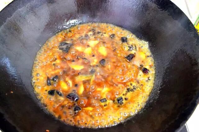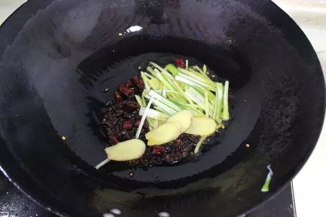 4、锅内加油,倒入辣椒段,花椒,姜片,葱丝爆香。