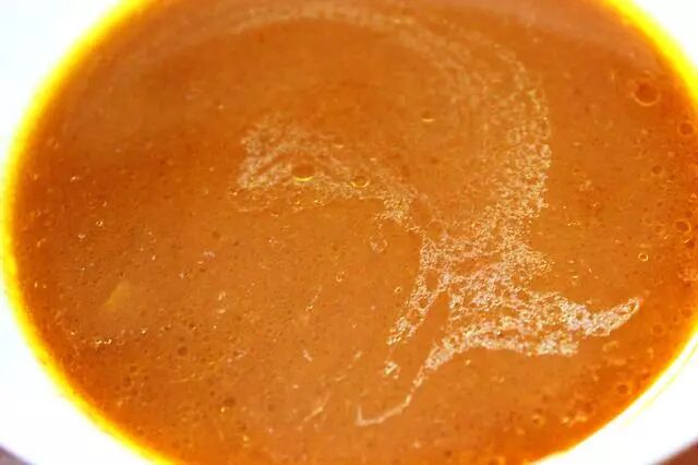 6、将调好的汤汁用过滤网过滤一下,这样汤汁纯净比较好看,将杂质倒掉。