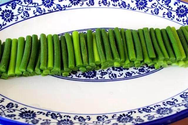 1、现将蒜薹焯水,切段摆盘,摆成一条直线。