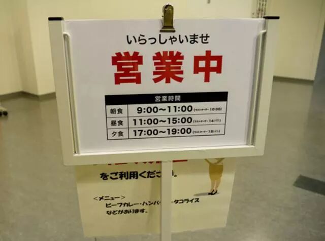 这是其中的一个食堂,上边写着三餐的供应时间,早餐从九点到十一点,午餐从十一点到十五点,午餐从十七点到十九点。