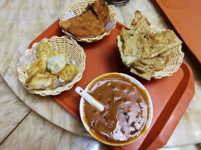 肥瘦适宜的薄牛肉片、爽口的黑木耳,晶亮的粉条,嫩脆的海带丝,带着红皮下锅的花生米,也有下豆皮或腐竹的,一起在加了麻椒的褐色汤汁里煮就。外表其貌不扬,内里却极富乾坤,这大概就是胡辣汤的魅力吧。一口下肚,胡椒的辛辣味儿直冲脑门,这样刺激的食物居然还可以做早餐!