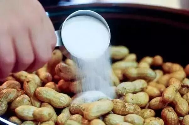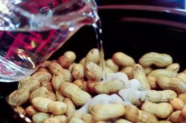 2.将洗净的花生倒在锅里,加足量的盐进去(盐水花生本身吸收盐分能力较差,可以相对多放盐,保证花生的味道可口)。