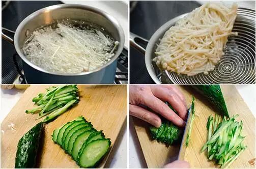 1.水烧开后放入金针菇烫30秒,捞出后放凉加入葱丝、黄瓜丝、胡萝卜丝拌匀。