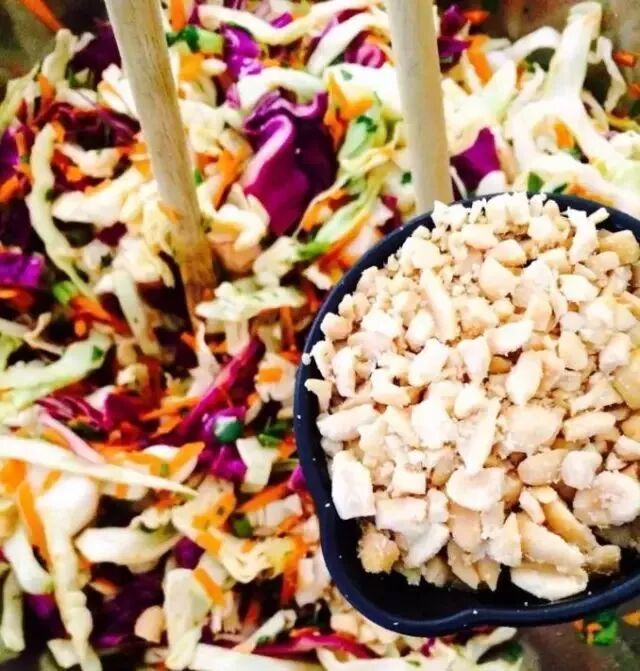 原料:包菜、胡萝卜、葱花、花生碎、盐、醋、辣椒油、香油、熟芝麻、鸡精